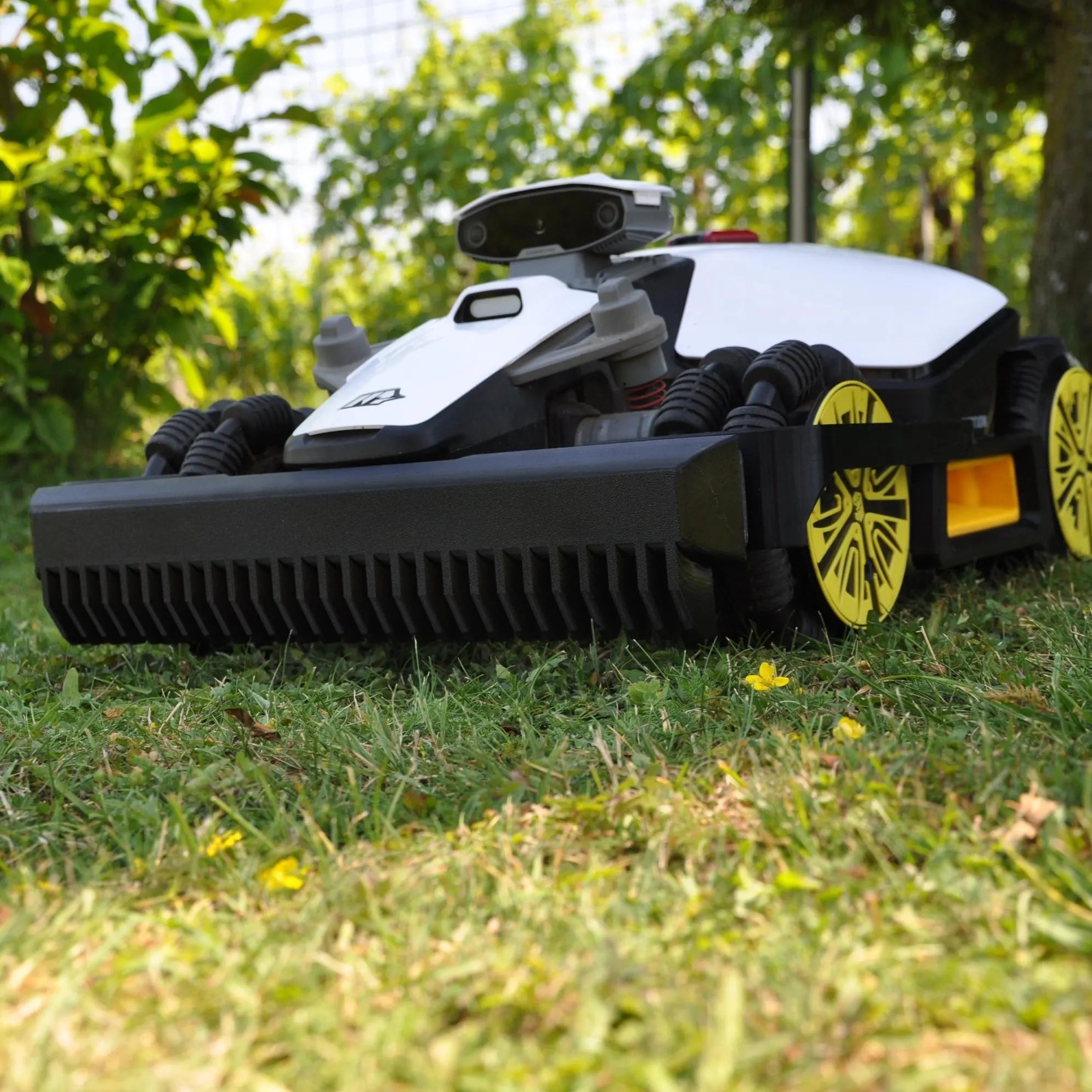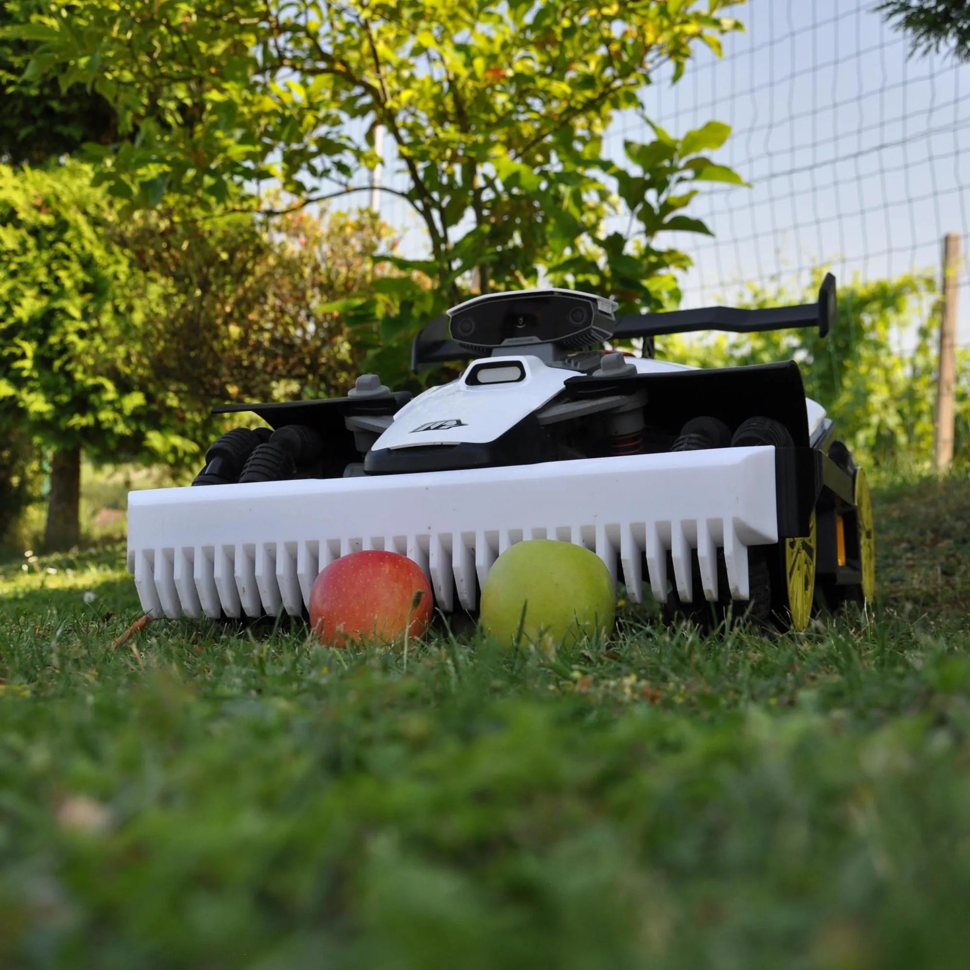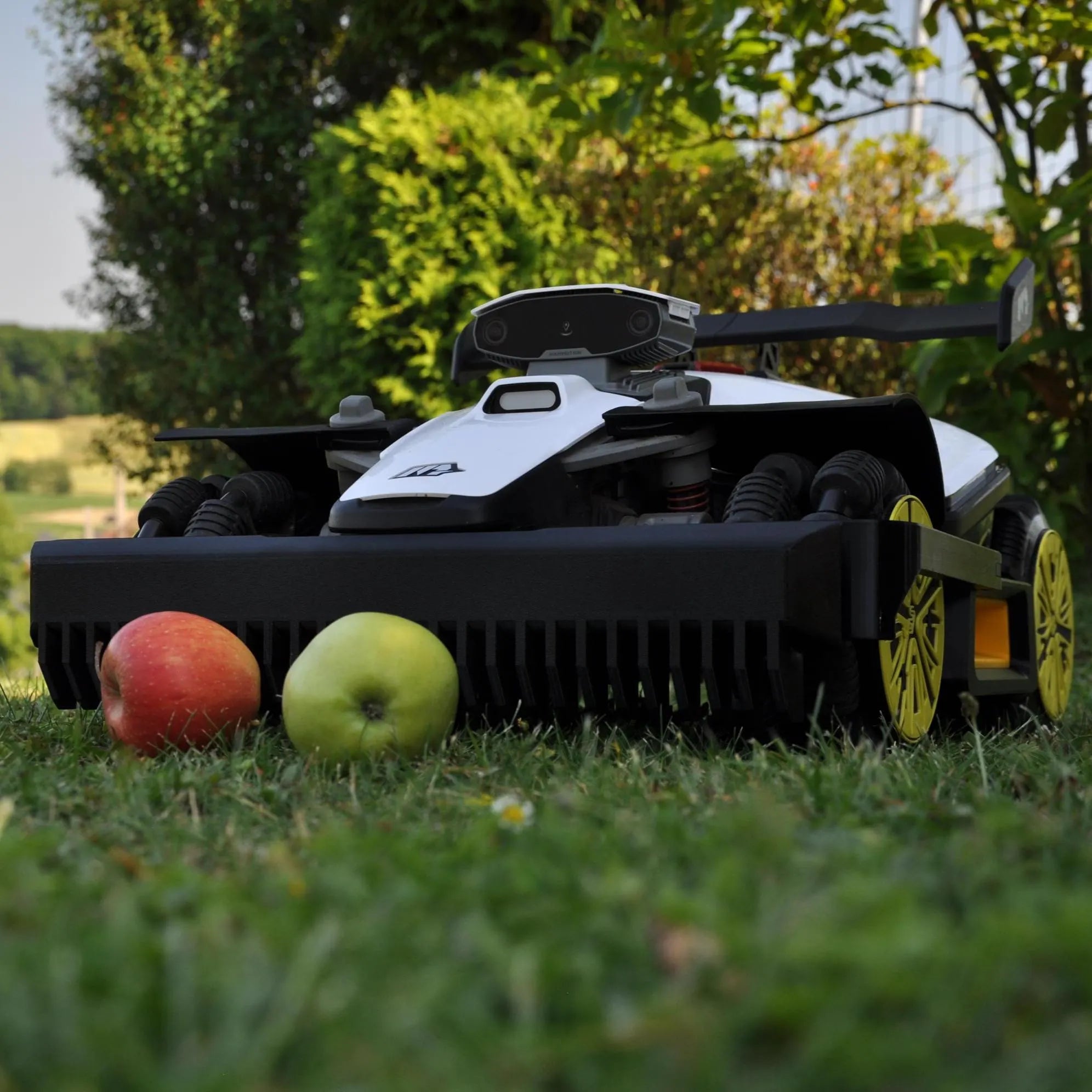Its integrated sensor detects obstacles (e.g. apples) and allows the mower to react intelligently to avoid them.